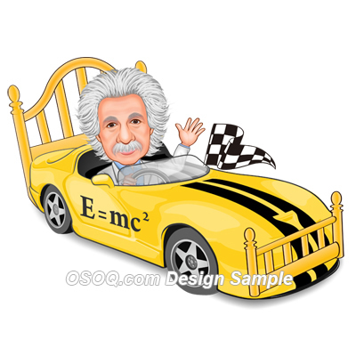 the driver of a speeding race car that looks like a bed with the E= MC2