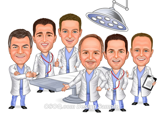 standing around the operating table. Please make their outfits to be
