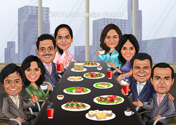 caricature drawn of we 8 people having lunch in our cafe. The scene