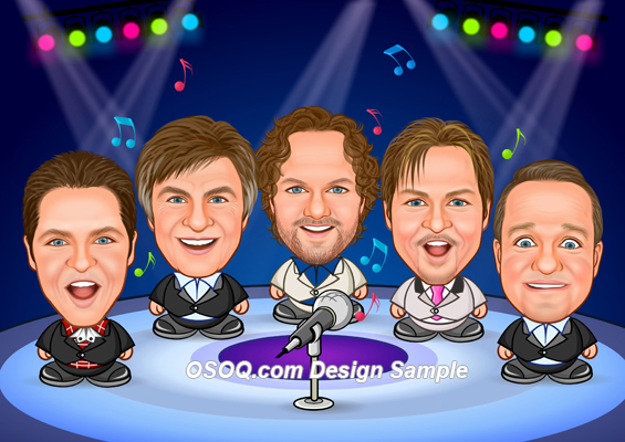 * I need a group caricature of 5 guys who are in a singing group. I